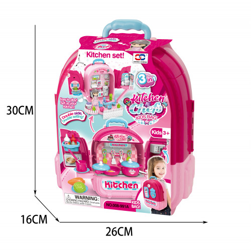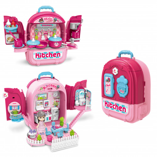 Es mochila, cocina con accesorios y casita de muñecas.