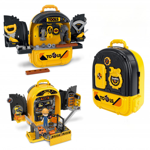 Es mochila, banco de trabajo con herramientas y taller de reparación para autos